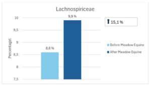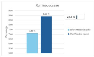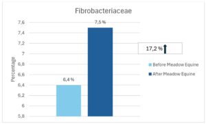 In a trial, 12 horses in a single stable were being fed a commercial diet, and the object of the trial was to determine the impact of specifically selected seaweeds on those horses after a period of 60 days of being fed the product on top of their standard diet. 5 of the horses were selected for microbiome assay. Faecal samples were taken before the trial and at the end of the trial. Each sample was sent for a 16S microbiome assay. In this result the assay results were aggregated and averaged to provide a “Before Meadow Equine” and an “After Meadow Equine” grouping, with the intention that directional shifts in the relative abundance of key microbiota could be reviewed